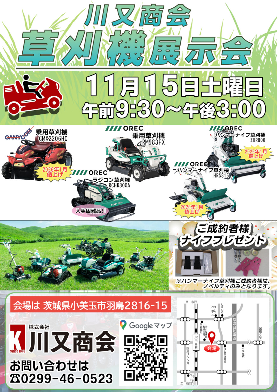 乗用、ハンマーナイフをはじめとした草刈機の販売、修理・メンテナンスと